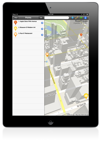Points can be added by holding your finger on the desired location, from search results, or by using the + menu.