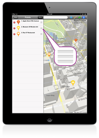 Tap the label to modify the details or the pin, or to set the route type for getting to that point.