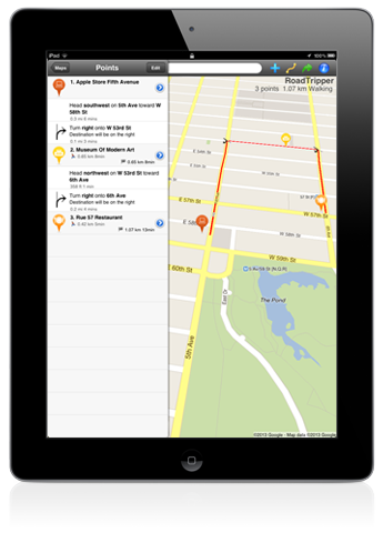 Turn-by-turn Google Directions for "by car", "cycling" or "walking" routes are displayed in the Points list.