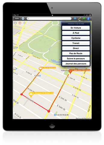 Un parcours proposé sur les rues peut être affiché en choisissant l'un des 4 premiers types de routes, à partir du menu Routes