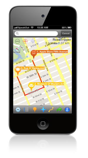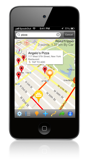 Points can be added by holding your finger on the desired location, from search results, or by using the + menu.