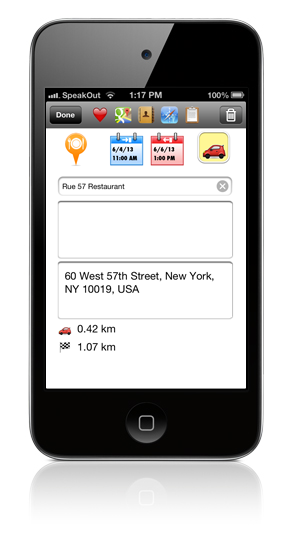 - One pin customizable with meaningful colors and symbols to indicate, for example, the type of place: restaurant, hotel, museum.... Tap the pin to change the icon or to add symbols.