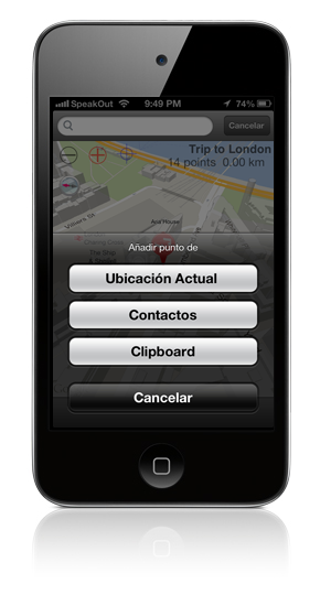 Puntos pueden ser añadidos por la celebración de su dedo en el lugar deseado, a partir de los resultados de búsqueda, o utilizando el menú +.
