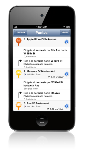 Google llegar "paso a paso" para las rutas "en coche", "ciclismo" y "a pie" se muestra en la lista de Puntos